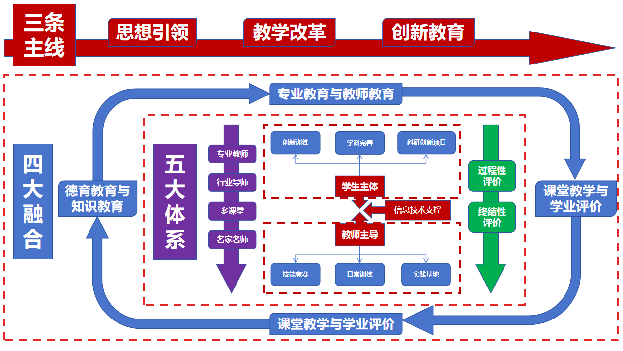 该案例介绍了我院数学拔尖创新人才培养模式,把思想引领、教学改革、创新教育“三条主线”作为主抓手,持续强化德育教育与知识教育、专业教育与教师教育、课堂教学与学业评价、科学研究与创新教育“四大融合”,构建了“专业教师与行业导师协同、多课堂合力、名家名师助力”的德育培养体系、“学生为主体、教师为主导、信息技术支撑”的课堂教学体系、“技能竞赛为引领、日常训练为主、实践基地协同”的教师教育实践技能训练体系、“过程性与终结性相结合”的全过程学业评价体系、“创新训练为主体、学科竞赛为引领、科研创新项目为驱动”的创新能力培养体系“五大体系”。