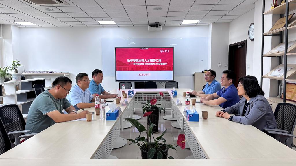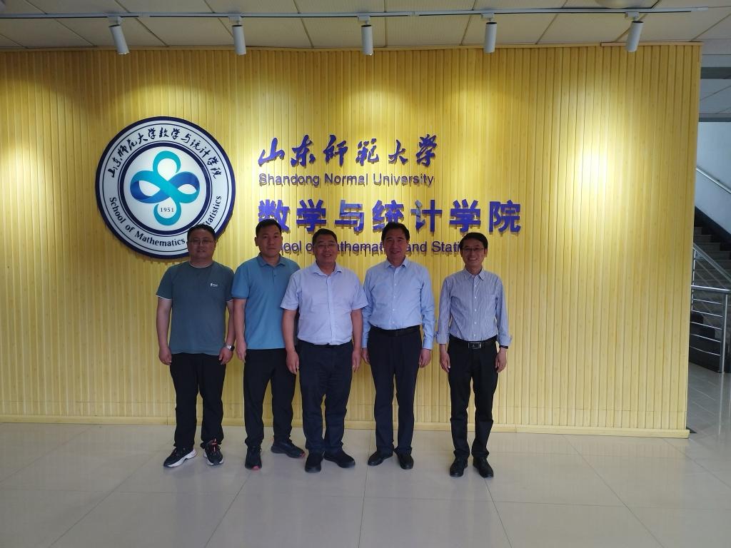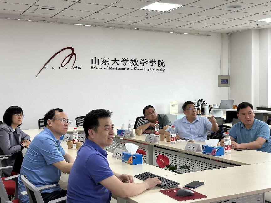 4月19日下午,杨院长一行前往山东大学数学学院交流,在山东大学数学学院党委书记王光辉教授、副院长王鹏辉教授等人陪同下,参观山东大学数学学院八楼平台教学、科研成果展,随后在学院会议室开展座谈,双方就学科建设、人才培养、科研与团队建设、学科竞赛等方面进行了深入的交流,相互学习工作方法与成功经验,助力学院学科建设和人才培养的高质量发展。