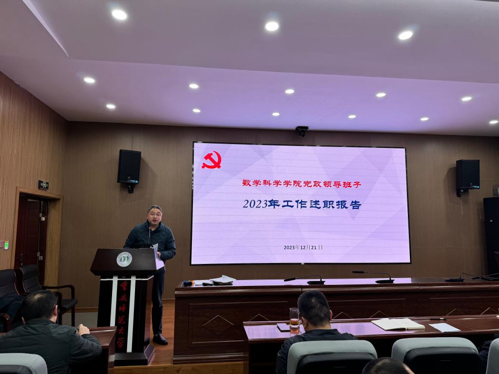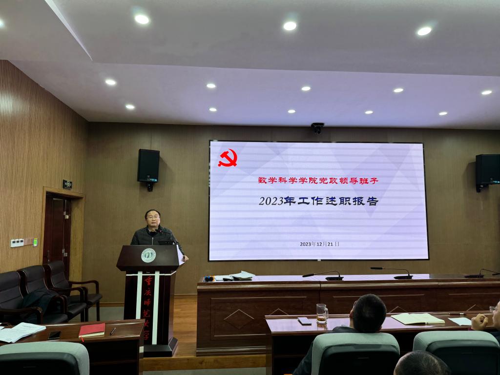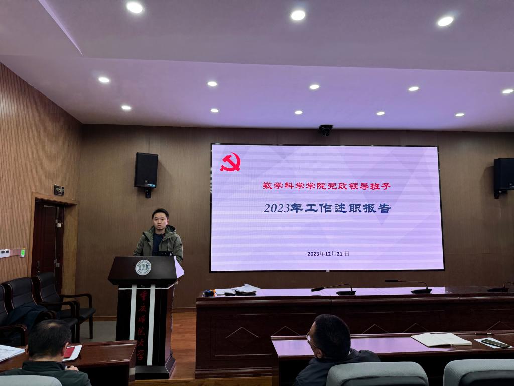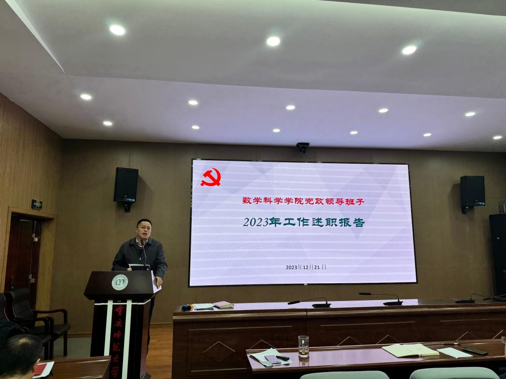 首先,杨江水书记代表领导班子述职。他从高起点谋划推进学院2023年工作、高标准完成主题教育活动、高水平推进学院事业发展、高强度破解学院发展难题、全方位推进70周年校庆筹备工作、多层面汇聚发展力量、科学规范有序开展制度理院七个方面介绍2023年度学院党政领导班子工作成效。接着,学院院长杨志春做个人述职。杨院长就分管的学科建设、人才与师资队伍建设、财务、资产等工作进行述职,梳理学院年度行政工作要点,落实事业发展重点任务与学科建设;积极推进国内合作与社会服务等六个方面详细梳理2023年度取得工作成绩。他讲到,学院取得的成绩,是全院教职工共同努力的结果。希望全体教职工再接再厉,争取更大的成果。学院党委副书记袁小于就分管的本科学生工作、招生、纪检等工作进行述职。副院长赵克全就分管的本科教学、学科竞赛等工作方面进行述职。副院长张文萌就分管的科研、研究生工作等工作方面进行述职。最后,学院党委书记杨江水就个人分管的党的建设、意识形态、师德师风等工作进行了述职,他从努力把航导向,推动学院提质转型;强化政治建设,提升党建工作水平;坚持党管人才,多措推进队伍建设等九个方面介绍个人履职情况。