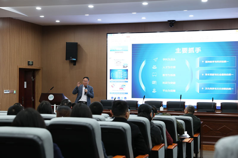 针对全国第五轮学科评估,杨新民教授接着分享了对数学学科发展的思考。他先详细介绍了重师数学学科自办学以来到获批一级学科博士授权点近70年的发展历程,着重介绍了重师数学学科发展历程中硕士点和博士点建设、获批市级重点学科、数学与应用数学专业建设等几个重要时期情况。面对全国第五轮学科评估后,数学学科建设处于“逆水行舟,慢进则退;百舸争流,奋楫者先”的境地,如何进一步提升竞争力,如何在新时代新征程中奋勇争先、踔厉奋发提出建议。他指出,坚持以教学为基础、抓好本科专业建设、硕士点和博士点建设;坚持以学科建设为龙头,凝练学科建设方向,加大人才支撑,突出实力水平;坚持以科研为突破,立足大平台、大项目、大奖项,着力打造一批高质量论文和著作。以“功成不必在我,功成必定有我”的精神,力争在学科建设上重整行装再出发,续写发展新篇章,打造全国有重要影响的数学一流学科。