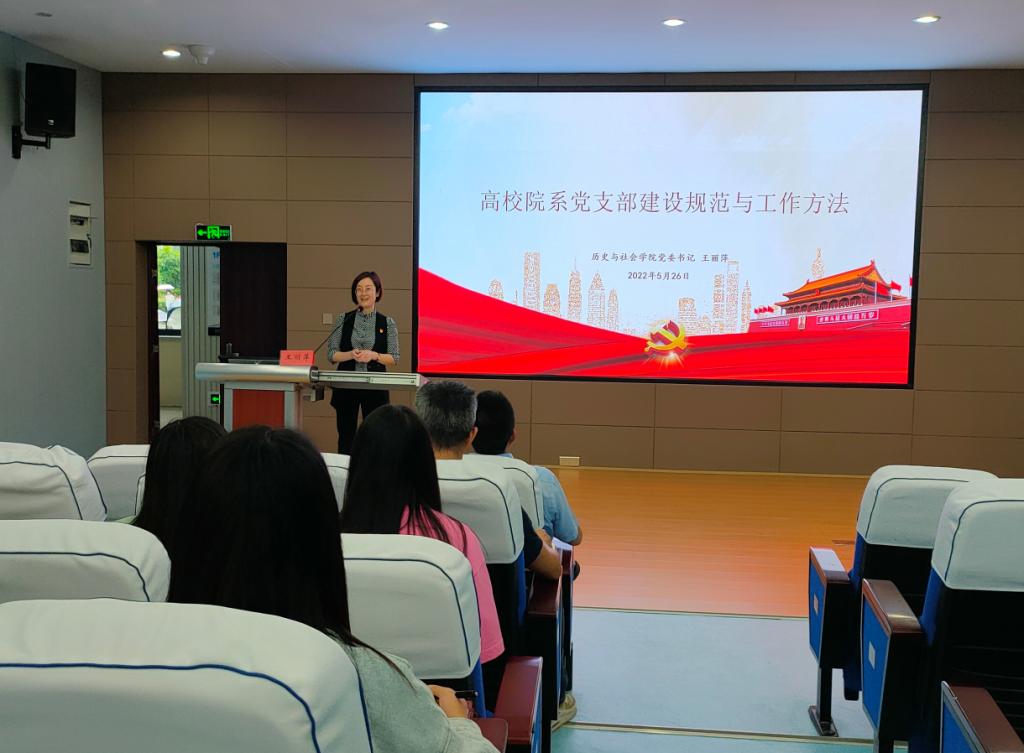 王丽萍书记从高校院系党组织的地位与作用出发,指出院系党支部是高校党建的“最后一公里”,是引领学院事业发展的保障,必须高举中国特色社会主义伟大旗帜,按照《中国共产党普通高等学校基层组织工作条例》提出的工作原则开展高校党支部建设。王书记细致介绍高校党支部组织设置、组织架构、组织职责等内容,尤其是以历史与社会学院高校党支部建设为例,详细介绍了高校党支部组织生活制度、党员管理工作规范、党员发展工作规范、思想政治工作要求。最后,王书记提出通过落实主体责任、从严从实管理、创新方式方法、强化监督问效做好高校院系党建工作,最终实现学院党建与其他工作融合共促、双向奔赴的良好局面。