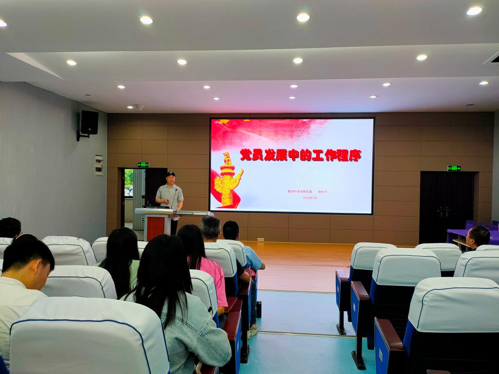 学院党建组织员杨光平就党员发展中的工作程序作了详细讲解。结合个人多年的党务工作经历,杨老师细化讲解申请入党、入党积极分子的确定和培养教育、发展对象的确定和考察、预备党员的接收、预备党员的教育考察和转正五个流程的具体步骤以及容易出现的问题。杨老师特别强调党务工作队伍在支部发展党员工作中起到的重要作用,应当严格遵守发展党员程序,对发展对象进行深入系统的培养教育和全面政治审查,切实保障发展党员工作的严肃性、规范性,进一步增强新发展党员的荣誉感、责任感,保证新发展的党员质量,保持党的先进性和纯洁性。最后,学院新一届的党务工作队伍进行了合影留念。
