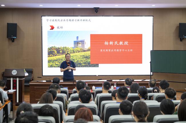中国科学院大学韩丛英教授主持讲习班开班仪式,并详细介绍了学习最优化方法专题讲习班的相关筹备工作及准备情况。重庆国家应用数学中心主任杨新民教授在开班仪式上致辞,他结合国家自然科学基金重大项目,介绍了学习最优化方法的前沿动态和我校开展学习最优化学术交流的具体情况,并从AI在运营中的应用角度出发,介绍了本次讲习班的专家团队。