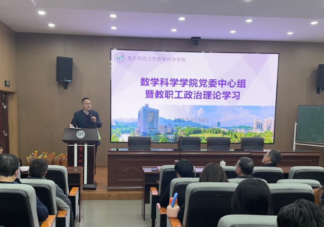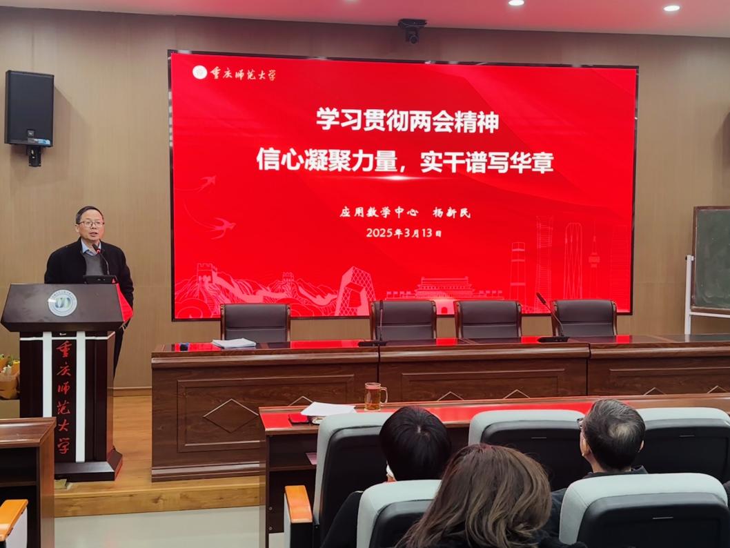 3月13日下午,PA视讯官网在汇贤楼122报告厅召开党委中心组暨教职工政治理论学习会议。全国政协委员、重庆国家应用数学中心主任、数学学科带头人杨新民教授作题为“学习贯彻2025年两会精神:信心凝聚力量,实干谱写华章”的专题报告。全院教职工参会,会议由学院党委书记杨江水主持。