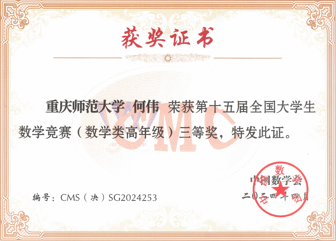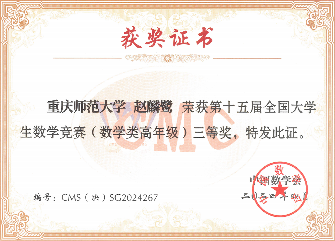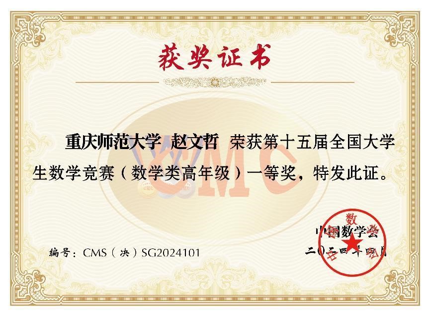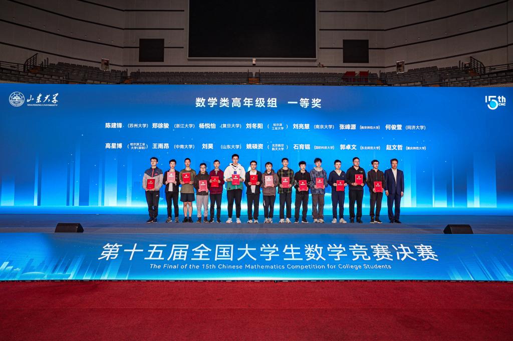 近日,第十五届全国大学生数学竞赛决赛在山东大学成功举行,决赛分为三个组别:数学类高年级组、数学类低年级组、非数学类。我校参赛代表队经过激烈角逐,共获得了全国一等奖1项,二等奖1项,三等奖3项的好成绩。该项竞赛全国一等奖是我校历年参赛中首次获得,是我校学子参加数学高水平赛事的重要突破。