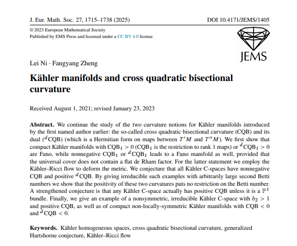 2025年,PA视讯官网郑方阳教授与合作者论文“Kahler manifolds and cross quadratic bisectional curvature”发表在国际基础数学的顶级期刊《Journal of the European Mathematical Society》(欧洲数学会杂志)第27卷第4期,1715-1738页,为近期国际复几何领域“曲率-流形分类”研究的突破性进展,不仅深化了对齐性空间几何特性的理解,更为解决经典猜想提供了关键思路。