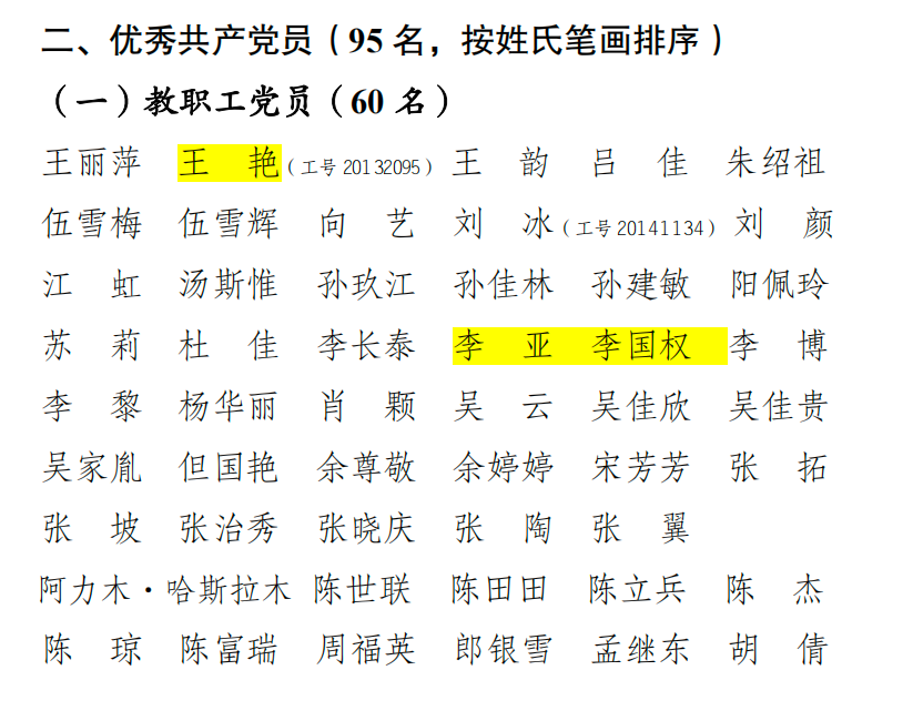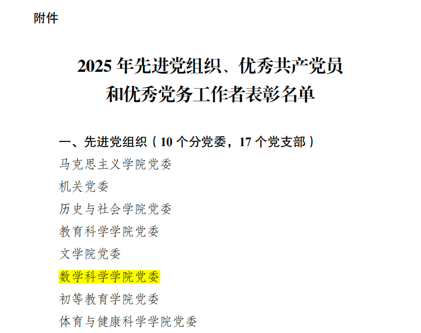 运筹与统计系党支部李国权、应用数学系党支部王艳、政治辅导员李亚、研究生三党支部罗晓璇获评校级“优秀共产党员”。