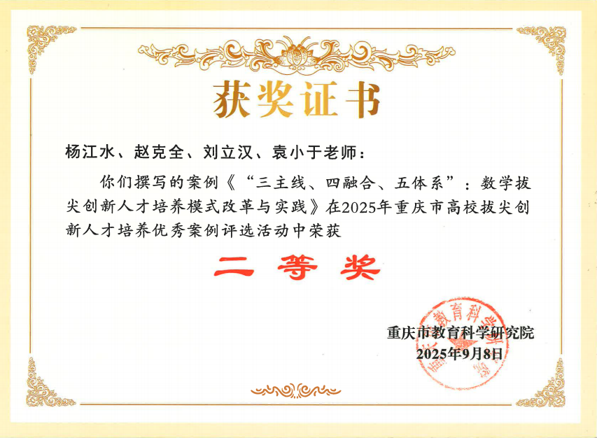 近日,重庆市教育科学研究院发布了《关于重庆市高校拔尖创新人才培养优秀案例获奖情况的通报》,我院杨江水、赵克全、刘立汉、袁小于申报的《“三主线、四融合、五体系”:数学拔尖创新人才培养模式改革与实践》获评重庆市高校拔尖创新人才培养优秀案例二等奖。