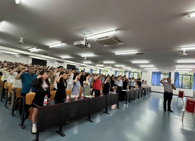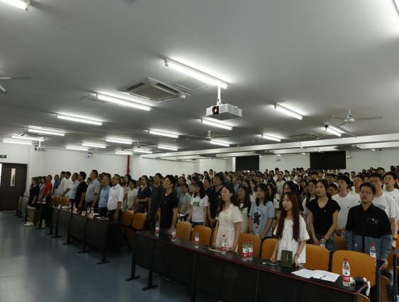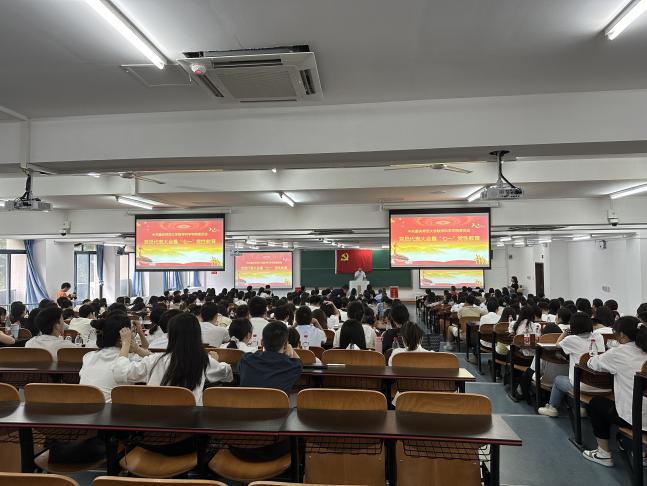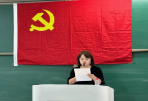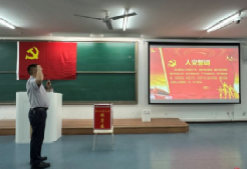 随后,全体党员起立,奏唱《国际歌》。 党委书记杨江水教授带领老党员重温入党誓词、新党员入党宣誓 。300余名党员高举右拳,面向鲜艳党旗,重温这段庄严的入党誓词誓言:“我志愿加入中国共产党,拥护党的纲领,遵守党的章程,履行党员义务,执行党的决定,严守党的纪律,保守党的秘密,对党忠诚,积极工作,为共产主义奋斗终身,随时准备为党和人民牺牲一切,永不叛党。”铿锵有力的誓词在教室久久回荡,为青春注入更为深刻的意义,为信仰奏响最激昂的乐章!