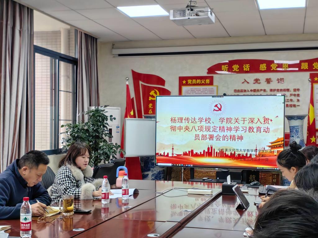 首先,支部书记杨理传达学校、学院关于深入贯彻中央八项规定精神学习教育动员部署会的精神,并结合学院党委关于该项工作的动员部署要求,对党支部落实中央八项规定精神工作进行全面部署。她提出三点要求:一是充分认识本次学习教育的重要意义,全面落实学习教育各项工作安排。支部要通过“三会一课”、主题党日等活动,线上线下组织全体党员认真学习相关内容,并结合实际开展交流讨论。用好《习近平关于加强党的作风建设论述摘编》、学习强国、共产党员网等学习资源,依托学院中心组切实把思想和行动统一到党中央决策部署上来,确保学习教育取得实效。二是一体推进学查改,在“学”中明规矩,在“查”中找差距,在“改”中见实效。三是坚持学用结合,以作风建设新成效奋力开创学院工作新局面。要把学习教育与推动党风政风、师德师风、院风学风建设相结合,以优良 党风正院风、强教风、优学风,提振干事创业精气神,切实将学习教育成果转化为推动学院各项事业发展的强大动力。同时加强宣传引导,坚持正确政治方向,确保学习教育有力有序、取得实效。