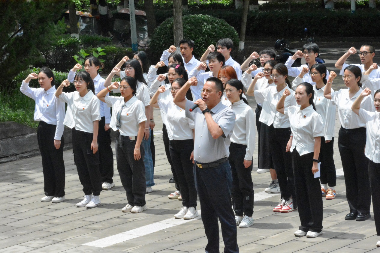 2023年6月12日14:00,学院党委在学校宣誓墙举行2023届毕业生党员重温入党誓词活动。学院党委书记杨江水、党委副书记袁小于、团委书记党委组织委员程伟、专职组织员杨理、学生党支部书记、毕业生辅导员及毕业生党员近八十人参加活动,党委副书记袁小于主持宣誓活动。