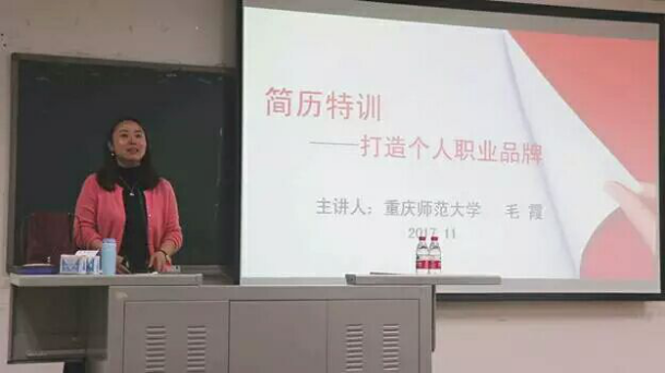 2017年11月2日晚7点,毛霞工作室主持人、重庆市就业指导名师、PA视讯官网数学学院党委副书记毛霞老师来到西南大学,在弘德楼501教室给新闻传媒学院2015级全体学生进行了一场名为“简历特训——打造个人职业品牌”的专题讲座。