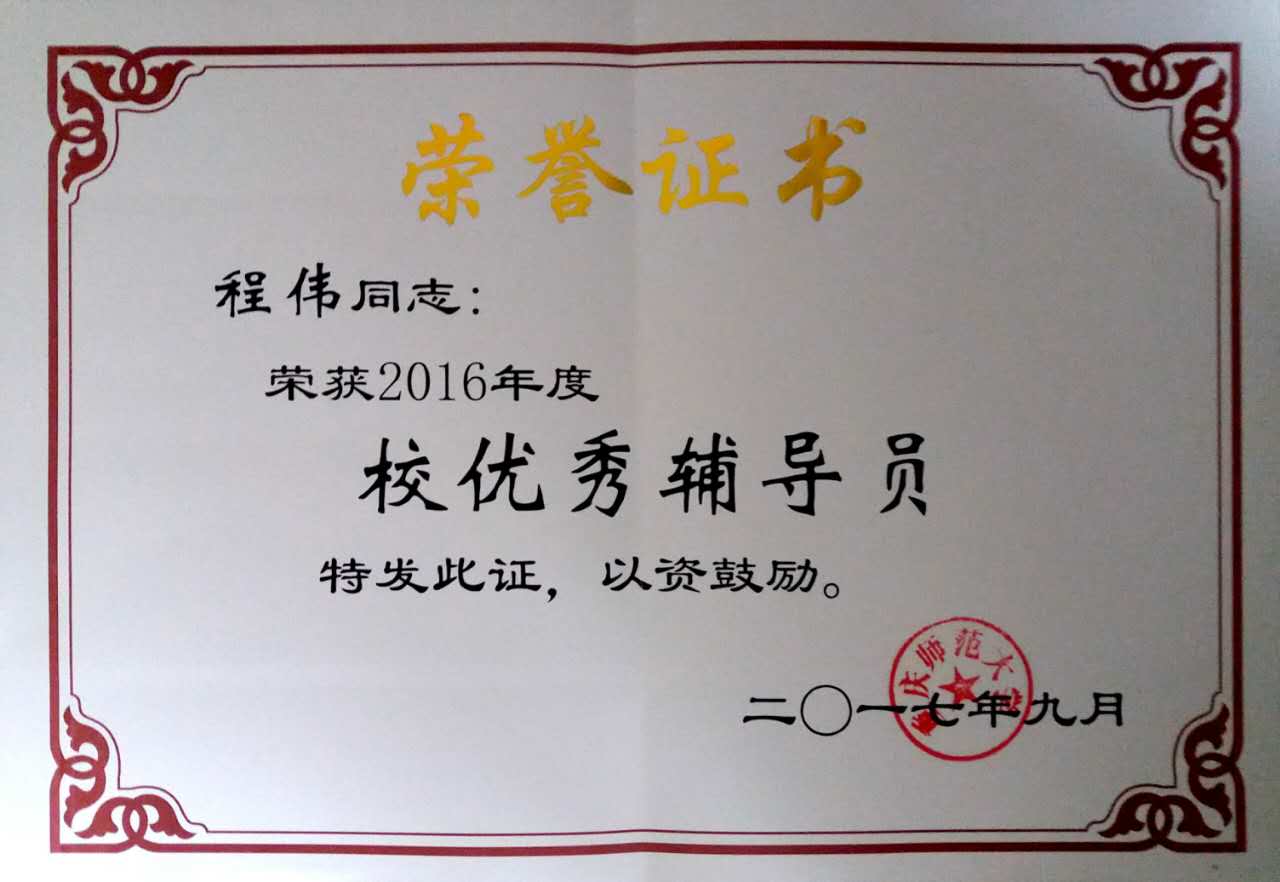 我院2014级辅导员程伟老师,在我校2016年度评优中荣获“优秀辅导员”称号。