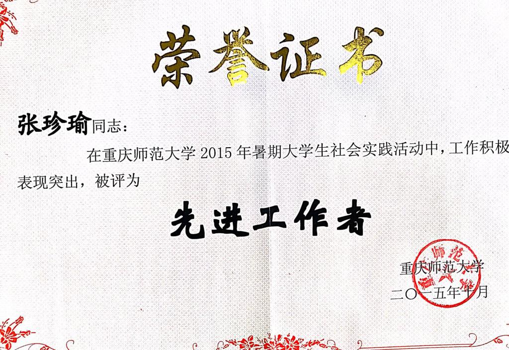张珍瑜老师荣获2015年暑假大学生社会实践活动“先进工作者”称号