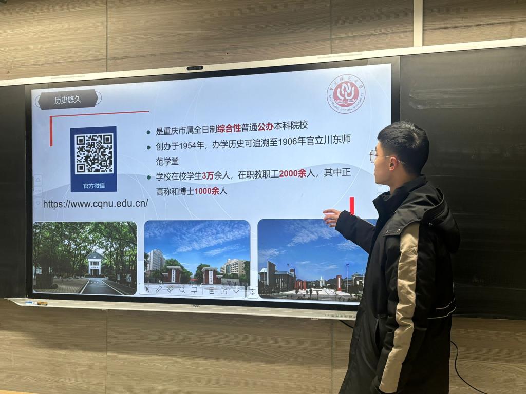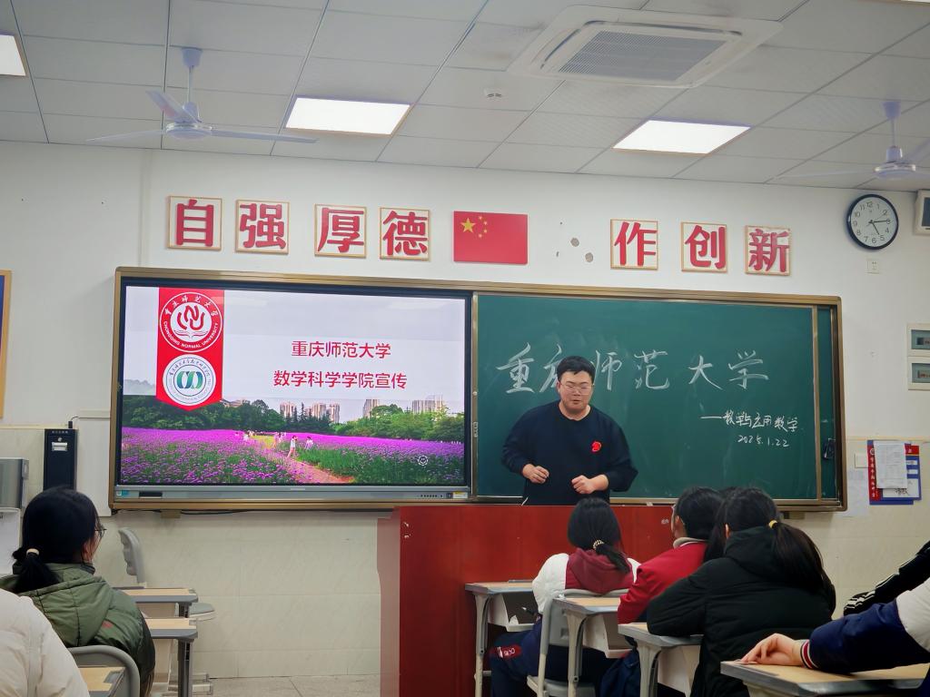 2024级数学与应用数学(师范)1班的毕一佳同学回到高中母校——西南大学附属中学开展宣讲。毕一佳同学通过播放学校宣传视频和分享自己的大学生活,向学弟学妹们展示了重庆师大丰富多彩的社团活动、优越的学习环境以及学识渊博的教师团队。他表示:站在母校讲台上,看着学弟学妹们眼中闪烁着期待的光芒,仿佛看到了曾经的自己;宣讲结束后,面对学弟学妹的积极提问,我满怀自豪地解答,并鼓励他们坚持奋斗;这次宣讲不仅让我重温初心,也让我感受到传递梦想的力量,愿他们心怀光芒,勇敢追梦!