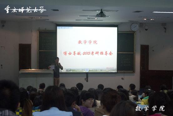 4月10日中午13:00,数学学院在15105教室举行“博士导航·2015考研指导会”。出席本次动员大会的有数学学院刘立汉老师、蔡刚老师、2011级辅导员韩彦坤老师及2011级全体同学。