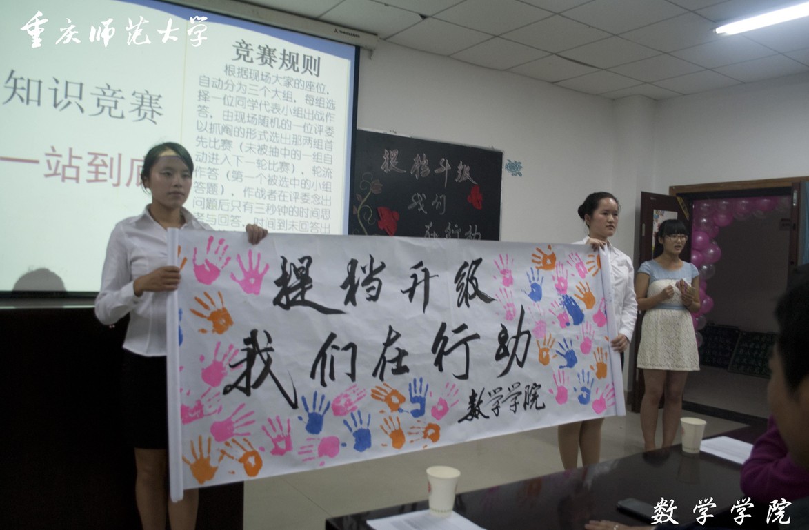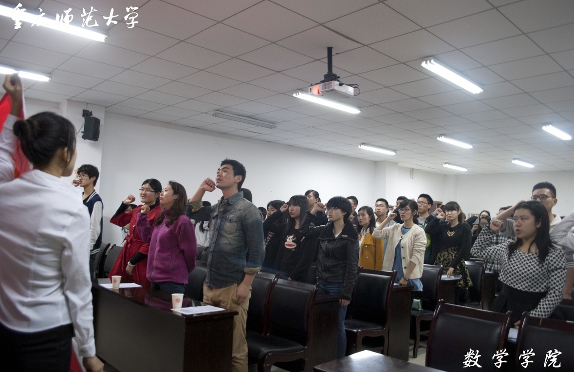 主持人首先介绍了我院为深入贯彻落实“优良学风提振计划”的相关实施方案,同时用PPT展示了2013级第三支部早自习出勤率100%、课堂出勤率100%、期末考试高通过率等良好的学习风貌。接着“学风建设话相声”、“提档升级一站到底”等互动性强的活动环节充分展示了数学学子积极踊跃参与学校提档升级的活跃氛围。随后全体成员在团旗下庄严宣誓:“在生活中,严于律己,明礼守信;在学习中,严谨认真,刻苦专研;在考试中,不交头接耳,不徇私舞弊。”为自己在提档升级工作中的积极参与许下庄严的承诺。