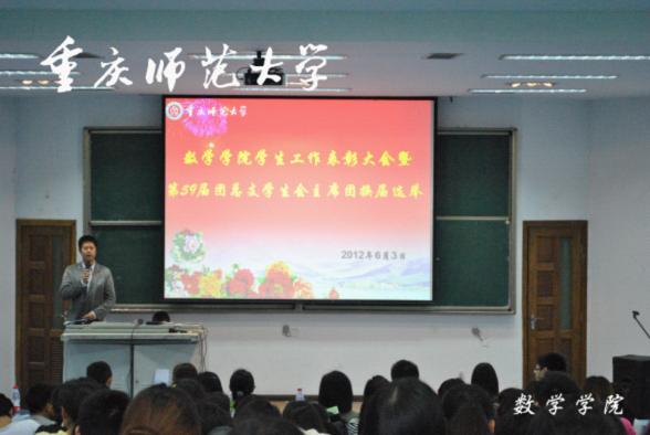 2012年6月3日14:30,数学学院2011—2012年度学生工作总结表彰暨第59届团总支学生会主席团换届选举大会在弘德楼5205隆重举行。数学学院分党委副书记毛霞老师、校研究生处培养与管理科副科长曾庆芳老师、外国语学院孟继东老师及我院各年级辅导员老师和第57届学生书记隆小霞、主席付科程、主席团成员刘强莅临大会。大会由团总支副书记李鑫老师主持。