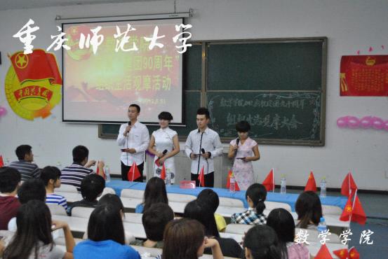 5月31日19:30,数学学院纪念建团90周年大型团组织观摩活动在图北楼7101隆重举行。数学学院团总支副书记李鑫老师,辅导员程伟老师和韩彦坤老师莅临活动现场。本次活动由团总支学生会牵头,院青马班,校五四红旗团支部2009第二支部和一级团支部2010级第四支部联合打造。