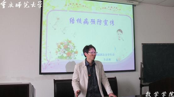 在会上,学生会生活部部长韦秋成对结核病的预防及国家对防治结核病的预防政策也作了详细介绍,我国早已对结核病的防治做出了非常有效的措施,既有专门针对结核病的防治所,也有政府与专家的关心,还有社会公益广告的大力宣传,不用担心治不起结核病,因为政府设立专门的防治机构为患者免费的治疗;不用担心治愈后受到社会的歧视,因为政府已将结核病宣传带到了校园,普及到了社会。同时讲解了结核病的危害及传播途径,在PPT效果的展示下,结核病的危害显而易见,而且资料显示中国的结核病的高发病率更让我们大家感到担心。但是在观看了形象的结核病防治宣传动画片之后,大家一颗悬着的心顿时也就放下了。数学学院做好了预防疾病的准备,防范于未然。