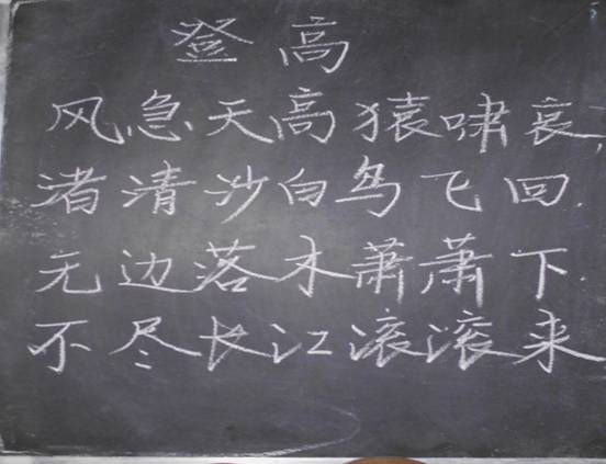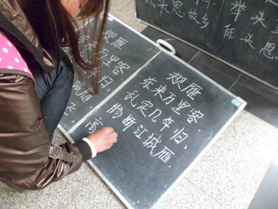 特色粉笔字练习是指我院大一学生们每周一至周五到集贤楼用粉笔字练习书写一首古诗,并在学院教师办公区域展示,同时由学生骨干成立专门小组负责每天出模板,检查出勤情况,批改优良等。楼道上整齐的黑板,学生们积极地参与练习,写得越来越好的粉笔字,这一切成了一道亮丽的风景线。该项工作丰富了学生的课余生活,通过自觉有序的实践书写,有效地培养学生优良的书写习惯,提高了学生的书写水平,促进了学生在全面发展的基础上充分增强师范生技能,适应了学生发展需要。