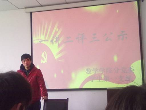 2012年3月12日,数学学院分党委学生第一党支部在集贤楼412会议室召开了“一讲、二评、三公示”支部组织会议。我院学生第一党支部书记韩彦坤老师和10级辅导员程伟老师参加了会议。