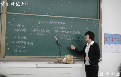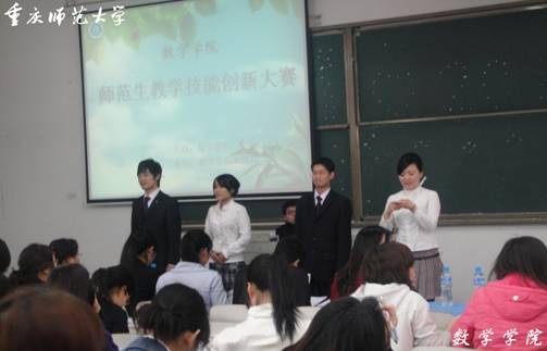 本次大赛分为即兴演讲、模拟授课、综合知识问答三个环节。12名选手胸有成竹踏上讲台,独具风格的演讲,熟练大方的授课,沉着冷静的答辩,赢得台下同学的阵阵掌声。10号选手陈超从“鸡兔同笼”讲起,设计新颖的数学活动环节,引出新课标情感教育的精髓,声情并茂,妙语连珠,获得比赛的最高分。5号选手杨岚带领大家一起用发现美的眼睛领略黄金分割的奥妙,从五角星、芭蕾舞演员,到断臂维纳斯,感受黄金分割在生活中的独特魅力。最后,陈超、傅佳、杨岚、刘强、隆小霞荣膺本次大赛前五名。