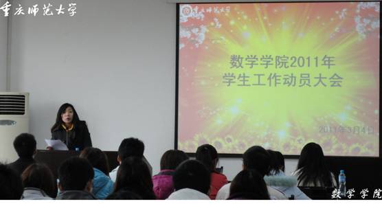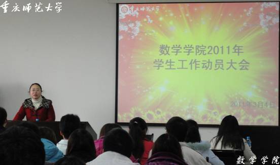 2011年3月4日12:50,数学学院新学期学生干部动员大会在集贤楼412隆重举行,出席本次会议的有数学学院分党委副书记毛霞老师,辅导员王雪颖老师、曾庆芳老师、程伟老师、王韵老师,第57届团总支学生会全体成员及各班班长支书。