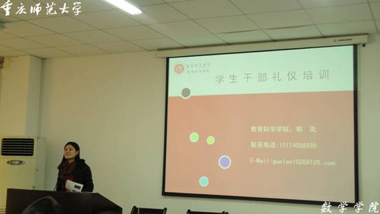 《论语》有云:“不学礼,无以立”,为了让广大同学提升礼仪素质,迎合社交要求,数学学院数学学院“青年马克思主义者培养工程”初级班暨二级团校培训之“学生干部礼仪培训”于12月8日下午1点在集贤楼412室隆重举行。此次培训特邀教育科学学院团总支副书记郭岚老师担任主讲人,数学学院团总支副书记李鑫老师担任主持。