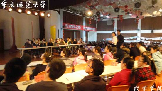 本次比赛共设有必答题、抢答题、操作题、选答题及风险题五个环节。试题内容涵盖了历史、地理、天文、生活等方面的基本知识。必答题环节,我院选手作了充分准备,将20分收入囊中。抢答题环节,他们专心听题,根据所掌握的知识积极应答,敏锐的反应、默契的配合给观众留下了深刻印象,并以20分的好成绩暂时领先。抢答环节,陈超同学代表小组“一气呵成”,迅速吹破气球,尽可能多地赢得答题机会。选手们的精彩表现赢得台下观众的阵阵喝彩。风险题环节,许多小组选择了放弃,但敢于挑战的数学学院代表队依然坚定着信念,毅然选择此题。功夫不负有心人,我院选手们一番精彩的作答赢得令人瞩目的40分,现场如潮水般的掌声久久没有停歇。风险搏击方显数学本色,最终我院以100分的优秀成绩获得本次比赛三等奖。