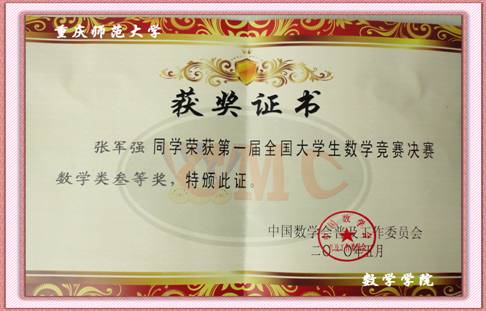 2010年5月15日,第一届全国大学生数学竞赛决赛在湖南长沙国防科技大学落下帷幕,我院2008级张军强同学荣获数学专业组全国三等奖。