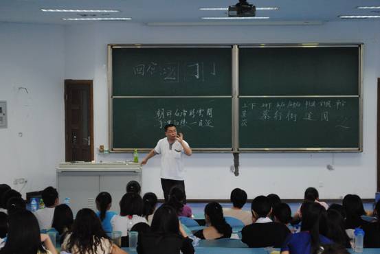 为提高我院学生的师范生技能——“三笔字”,即“钢笔、毛笔和粉笔”,2010年5月5日中午13:00,数学学院办公室主任柏仕坤老师应邀为我院2008级学生举行了一场关于“三笔字”的讲座,2008级辅导员曾庆芳老师莅临活动现场。