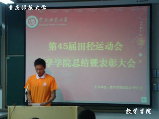 2010年4月16日中午1点整,数学学院在宏德楼5101隆重举行了PA视讯官网第45届运动会数学学院总结暨表彰大会。本次会议得到学院领导的高度重视。我院党总支书记何大海老师、院长金渝光老师、团总支副书记李鑫老师、辅导员王雪颖老师、曾庆芳老师莅临现场。出席此次会议的还有全体运动员及主要学生干部。会议由团总支副书记李鑫老师主持。