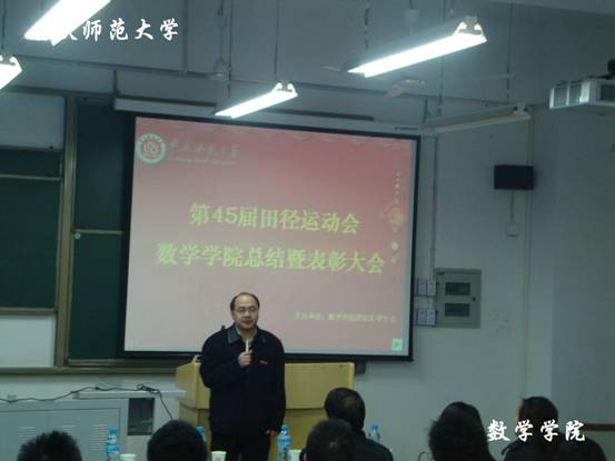 大会首先由党总支书记何大海老师作重要讲话。他充分肯定了数学学子在运动会中的出色表现,表扬了运动员奋勇拼搏,为学院争光的精神,嘉奖了我院看台上观众积极参与、为学院添彩的表现。同时,他也希望同学们在以后的学习、生活、工作中发扬自强不息、奋勇拼搏的数学精神,为学院争取更多的荣誉。接着,在场的老师为在运动会中取得佳绩的运动员们颁发了奖状及奖金。随后,运动员代表伍书林同学发言,他感谢学院领导、老师对运动员的关怀,表示要把团结拼搏的运动精神运用到以后的生活中,为学院的发展贡献自己的力量。