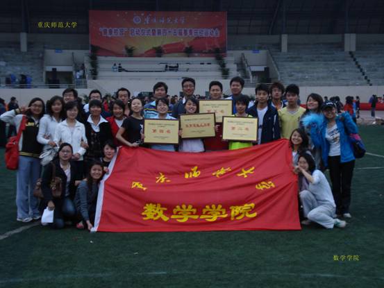 2010年4月9日下午,我校第四十五届田径运动会画上了圆满的句号。在这为期两天的运动会期间,数学人始终秉承“责任、荣誉、未来”的院训,以其团结互助、勇往直前的精神展示着数学学院的风采,取得了骄人的成绩。