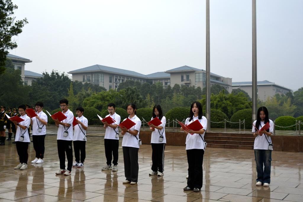 早上7点30分,在全体师生的注目下,国旗班护旗手步履铿锵,护送国旗入场。随着激昂的旋律奏响,鲜艳的五星红旗在细雨中冉冉升起,全体师生行注目礼并高声齐唱中华人民共和国国歌。