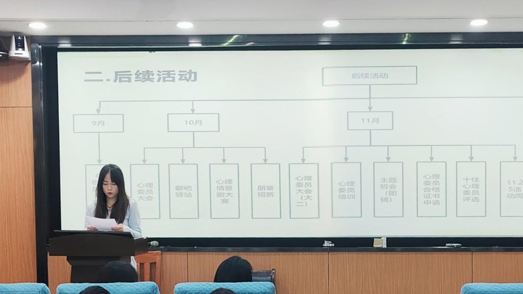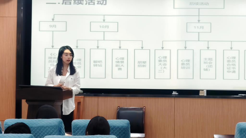 生活部负责人秦冰月同学就心理委员日常工作进行了说明。她指出,心理委员需按月填报“心情温度计”,及时掌握并反馈班级同学的心理动态,如发现异常情况须第一时间上报学院。同时,她详细介绍了心理委员合格证书的获取途径,明确需完成专项培训、慕课学习及主题班会组织三项基本要求。
