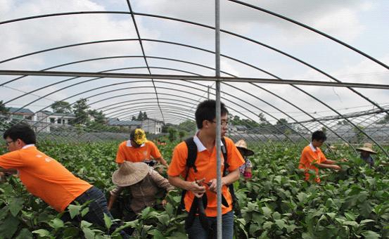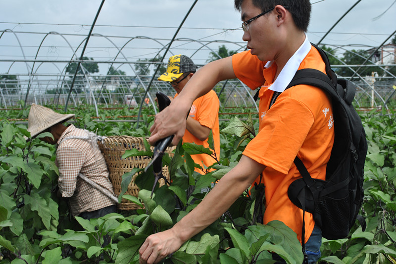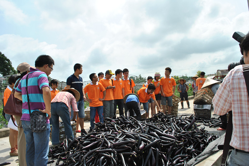 在整个参观过程中,同学们见识到许多没见过的先进农业技术,诸如无土栽培,太阳能灭蚊等。在参观时恰逢几天大雨后难得的晴天,见到农民在抢收茄子,同学们便立即加入到抢摘茄子瓜果的队伍中,帮助当地的农民到田埂里抢收。参观在一片汗水和欢声笑语中结束,在离开园区的的路上,虽然很累但是大家都表示这是一次很有意义的活动,都感慨着“我劳动我快乐”。