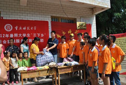 2012年7月3日,PA视讯官网数学学院团总支副书记李鑫老师、数学学院辅导员程伟老师以及我院暑期三下乡社会实践服务团成员在武胜县飞龙镇观音阁村举行了爱心传递衣物发放活动。