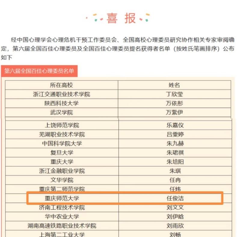 任俊洁同学是班级心理委员,同时他还是重庆市优秀学生社团“大学生朋辈心理咨询团”的团长、西南地区第一支手语翻译团队“译心”团队的副队长。在班级中,他密切关注同学们的心理健康状况,积极调动大家了解心理学小知识,并落实心理工作;在学校里,他发表心理健康主题推文,统筹组织了全校性规模的心理健康主题系列活动共50余场;在“译心”手语翻译团队中,他与听障同学分享心理健康知识及工作心得。今后,他也将继续从心出发,将爱与温暖传递给同学。