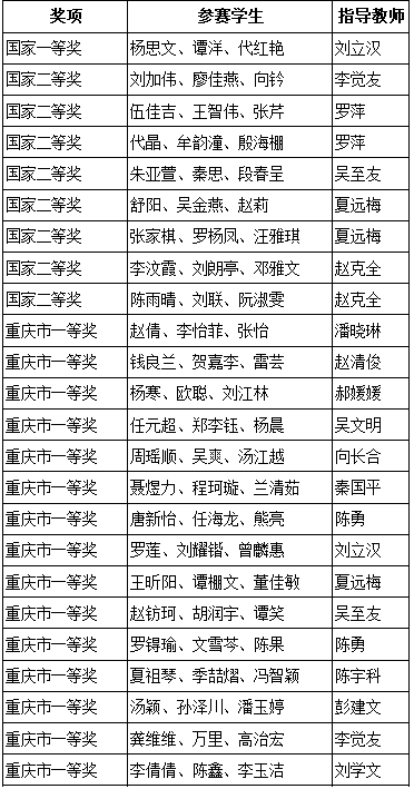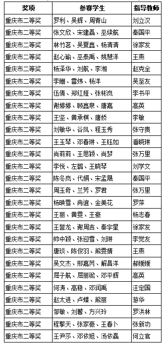 我院经过选拔推荐105个代表队参赛,共有51个队获奖。其中,全国一等奖1项、全国二等奖8项、重庆市一等奖15项、重庆市二等奖27项。据悉,2020年一等奖获奖比例为0.70%,二等奖获奖比例为2.87%。同时,我院赵克全、刘立汉、罗萍三位指导教师被评为2020年高教社杯全国大学生数学建模竞赛优秀指导教师。