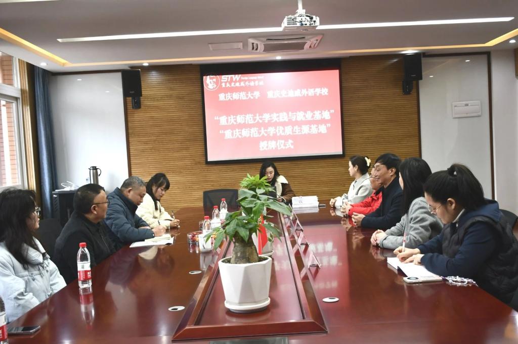 双方在史迪威外语学校会议室举行了座谈会,史迪威外语学校校长曾庆模,副校长蒋华、刘燕燕、赖仁君、刘欢等领导参加。曾庆模校长介绍了学校的发展历程,详细阐释了学校深耕教育30余年,关怀并致力于每一位学生的成长,始终坚守“让每一个孩子都能成为更好的自己”的办学理念。曾庆模校长表示学校希望选拔师德高尚、业务精湛、乐于奉献的育人队伍,也欢迎PA视讯官网毕业生前来应聘就业,学校为新老师的发展搭建了广阔的舞台。