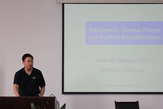 2012年5月17日下午3:00,四川大学博导、国家杰出青年基金获得者张伟年教授,应PA视讯官网数学学院和金渝光教授的邀请,为我院师生作了一场题为《Parametric normal forms and further simplification》的学术报告。报告由数学学院杨志春教授主持,金渝光教授、雒秋明教授、杜学武教授、王洪春教授和部分青年教师听取了本场报告。