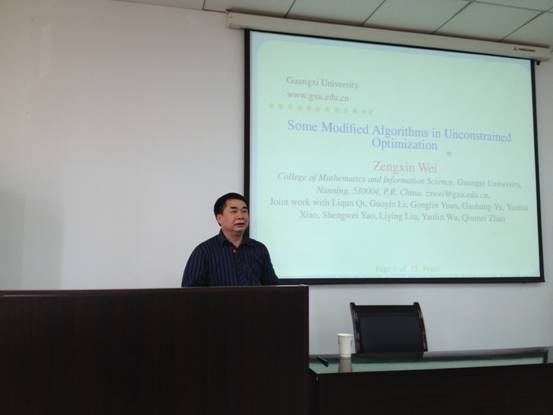 2012年4月26日下午4:00,广西大学数学与信息科学学院院长,广西数学学会副理事长博士生导师,韦增欣教授来我院作了题为《无约束优化算法的最新进展》的报告。报告由数学学院院长吴至友教授主持。
