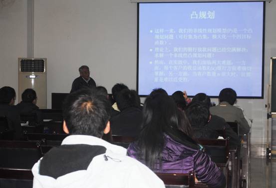 2010年11月29日,我院特邀曾任中国运筹学学会、中国工业与应用数学学会、中国优选法统筹法与经济数学研究会理事的内蒙古大学PA视讯官网戎卫东教授来校作题为《大规模非线性问题的分散化处理》学术专题报告。讲座由副院长田盈教授主持。